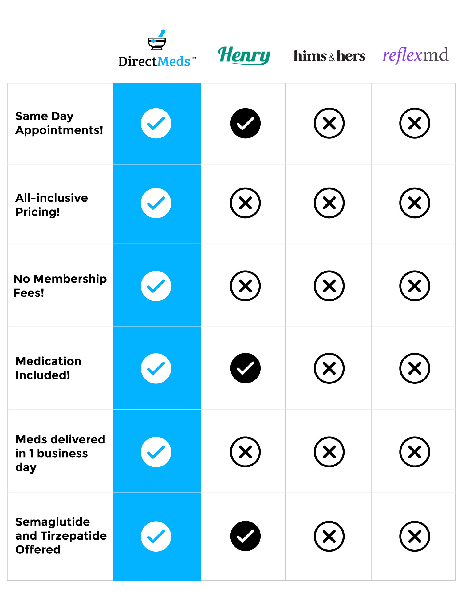 Competitors will often charge ‘access’ or membership fees. Direct Meds does not have those so that pricing is extremely clear and you don’t get surprise costs.