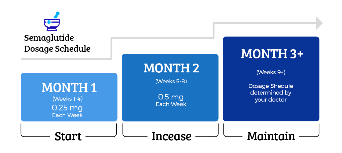 You will be provided with small insulin sized needles along with your medication. Your doctor will explain how and when to take your medication during your telemed visit. You will start with a low dose to begin your treatment once per week as your body gets used to the medication and increase your dose every 4 weeks until you are at your full dosage. Medication will be administered by injecting into the fatty area on your stomach weekly.