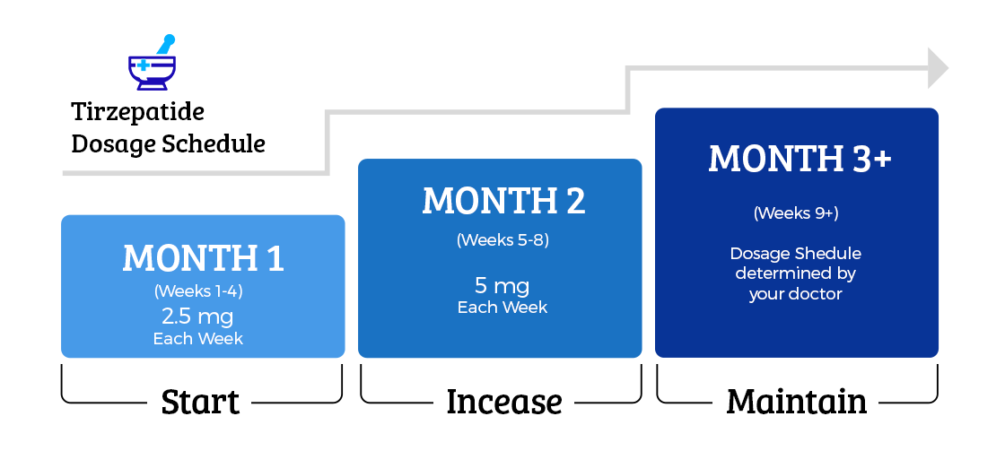 | Tirzepatide: | 2.5mg/week for the first 4 weeks 5mg/week for the next 8 weeks |