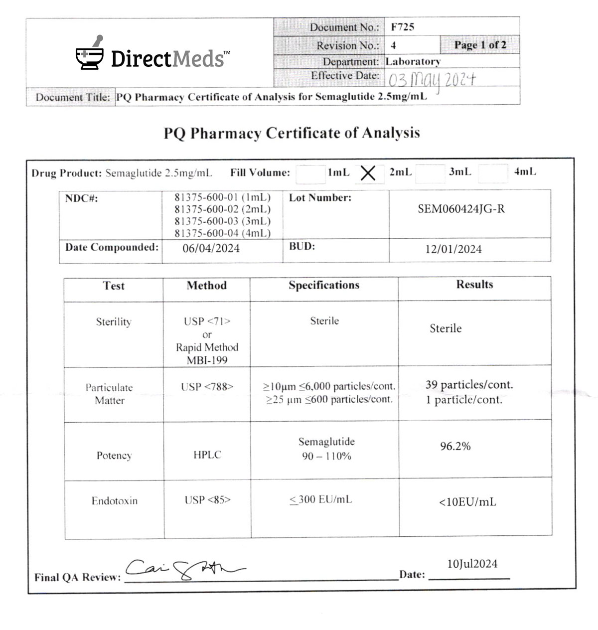 Direct Meds Semaglutide Purity Analysis